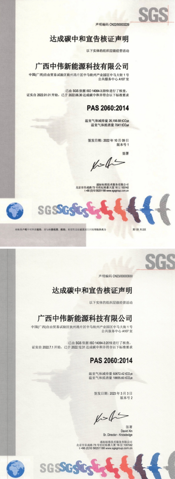SGS是国际碳排放管理公认的测试、检验和认证机构,此次认证由SGS依据ISO 14064-3:2019标准,于2022年9月与2023年2月两次对中伟钦州产业基地生产运营过程中排放产生的温室气体数据进行统计与核查,各项数据均经过详细评估、统计与现场审核,同时对相关数据声明、减排计划及中和方案进行严谨细致的文件审查、现场评审和技术评审,最终符合PAS 2060:2014的标准要求,证实中伟钦州产业基地达成碳中和。