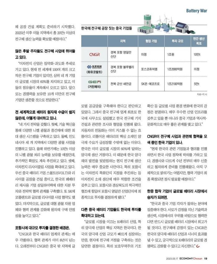 近日,韩国权威经济周刊《Economy Chosun(经济朝鲜)》专访中伟股份董事长邓伟明,并以“封面故事”刊发在第492期以“电池之战”为主题的周刊中。