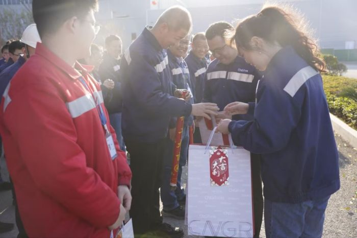 上午9点,中伟铜仁(上市主体)产业基地总经理赵能华走进基地各部门工作场地,为两千多名正投入新春第一天工作中的员工送上开工红包,寓意新年“开门红”,并祝愿大家龙年大吉、宏图大展。