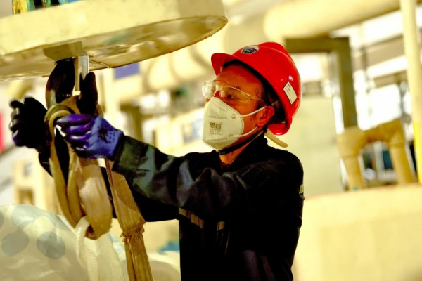 在四钴二车间,溶解员刘均芝一丝不苟地绑好吊绳,将原材料精准投放到位。溶解岗位要求穿戴全套护具,这进一步增加了刘均芝的体感温度,但他没有丝毫懈怠,在平凡的岗位上发挥出不凡的能量,用匠心书写着高温下的感动。他们车间的口号是:坚守岗位,不惧高温,保障安全生产。
